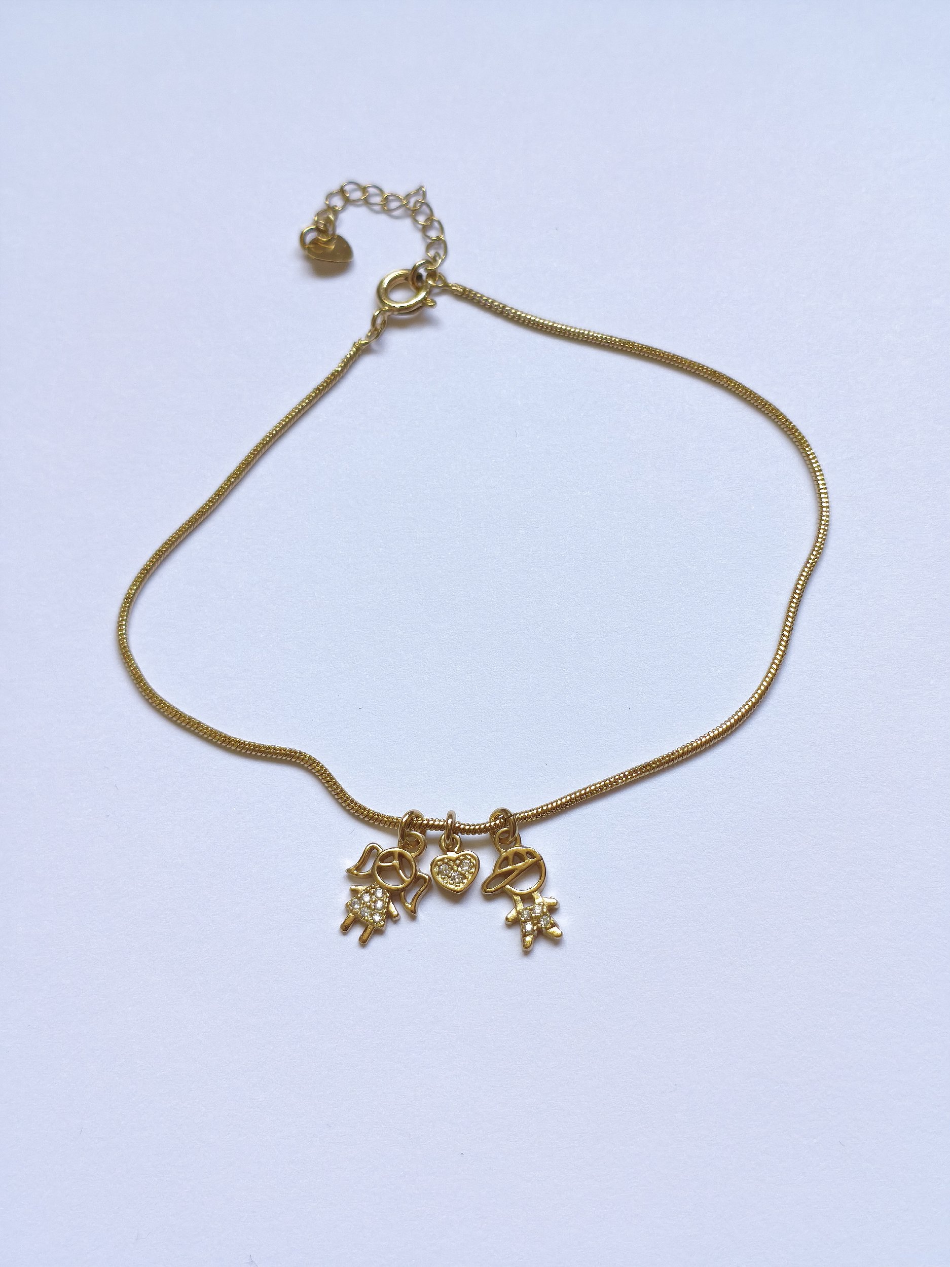 Conheça a Pulseira Dourada Filhos com Pingentes Cravejados, uma joia delicada que simboliza amor e união familiar. Com banho dourado de alta qualidade, esta peça oferece resistência ao desgaste diário e mantém seu brilho por muito mais tempo. Os pingentes representativos de menininho, menininha e coração são cravejados com micro zircônias, garantindo um acabamento sofisticado e elegante. A corrente fina é confortável para o uso cotidiano e o fecho com extensor permite ajuste personalizado para todos os tamanhos de pulso.